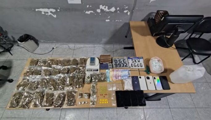 Na residência,foram encontradas várias placas de motos, aparelhos celulares sem procedência comprovada, chave para violar a ignição de veículos e entorpecentes dos tipos cocaína, ecstasy e loló.