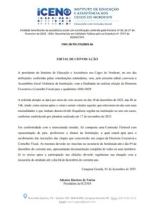 0 0 0 0 EDITAL DE CONVOCAÇÃO – ASSEMBLEIA ORDINÁRIA – ELEIÇÕES 2026-2029 Publicado em 1 de dezembro de 2025 EDITAL DE CONVOCAÇÃO – ASSEMBLEIA ORDINÁRIA – ELEIÇÕES 2026-2029