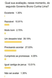 Da parte que reprova, 39,19% disseram ser a atual administração “um desastre total”; 27,03% cravaram que BCL está “precisando acordar”; e 13,51% apontaram que a gestão está “igual à cantiga da perua…”, totalizando a soma negativa em 79,73%.