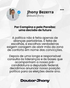 Publicado em 3 de março de 2026O pré-candidato a deputado federal Jhony Bezerra (Avante) anunciou oficialmente, por meio de suas redes sociais, o apoio à pré-candidatura do prefeito de João Pessoa, Cícero Lucena, na corrida pelo Governo do Estado em 2026. Em nota, o médico afirmou que a decisão foi baseada em convicções e diálogos com suas bases aliadas, destacando a experiência e a capacidade de gestão de Cícero como fatores determinantes para a escolha.