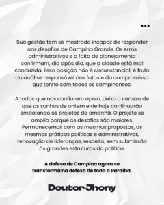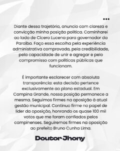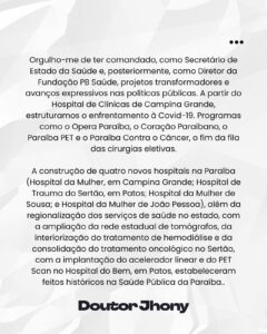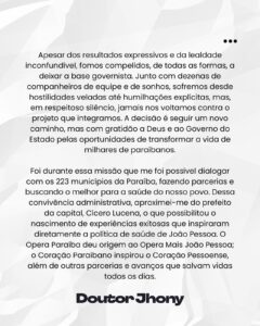 Ao longo do texto, o médico relembrou sua trajetória na administração pública, com ênfase na atuação durante a pandemia de Covid-19 e na coordenação de programas estratégicos como o Opera Paraíba, o Coração Paraibano e o Paraíba Contra o Câncer. Jhony destacou o orgulho pelos resultados alcançados na saúde pública e agradeceu pelas oportunidades que teve de transformar a vida dos paraibanos enquanto esteve no comando da pasta.