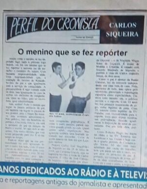 Foi linda a homenagem de sua equipe! Não é que eu acabei participando de forma anônima. A edição da matéria mostrou a página e a narração brilhante de Artur Lira citou a manchete que eu escrevera e editara, na versão impressa de APALAVRA em 91/92. Usando o pseudônimo Valmar de Almeida, publiquei a série Perfil do Cronista, na qual focalizava os profissionais da crônica esportiva de então, e Carlos Siqueira foi um dos perfilados. O menino que se fez repórter também se tornou um grande apresentador.
