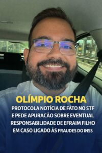 Publicado em 24 de março de 2026O advogado, professor e pré-candidato ao Governo da Paraíba, Olímpio Rocha, protocolou petição junto ao Supremo Tribunal Federal, dirigida ao ministro André Mendonça, relator dos procedimentos relacionados à chamada Operação Sem Desconto, pedindo a remessa dos autos à Procuradoria-Geral da República para apuração da eventual responsabilidade do senador Efraim Filho, também pré-candidato ao Governo do Estado, em fatos conexos ao escândalo das fraudes no INSS.