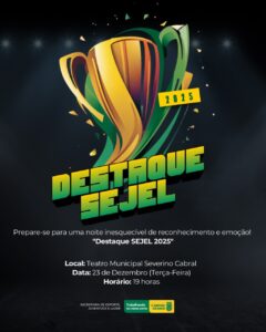 “Estamos fechando o ano com um balanço extremamente positivo e para comorar e também prestar conta do que fizemos, vamos entregar o prêmio “Destaque Sejel” em uma grande festa do esporte em Campina Grande, costumo dizer que atleta é igual a artista, vive de palma, pix e reconhecimento, isso é muito bom, reconhecer e aplaudir aqueles que ao longo do ano nos representaram tão bem”, enfatizou Ronaldo Neto.